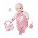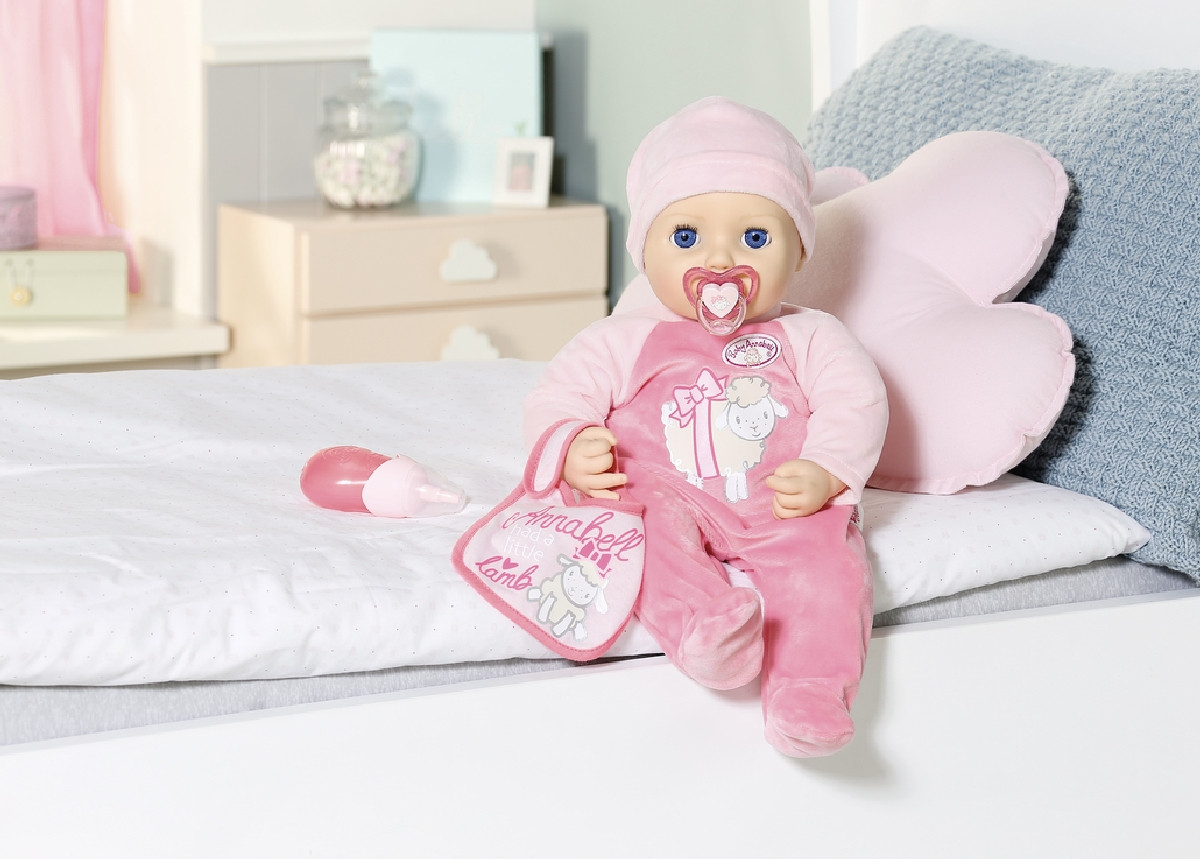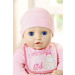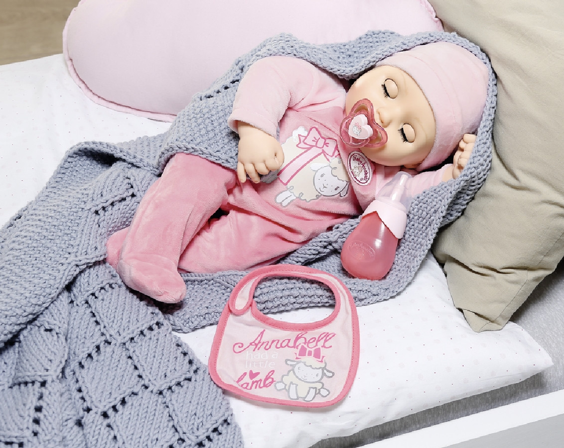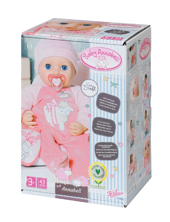 Funkční panenka Baby Annabell Annabell velikosti 43 cm pro děti od 3 let. Panenka se zvukovými funkcemi, která je jako skutečné miminko. Má mnoho funkcí. Pije vodu z lahvičky. Při pití z lahvičky hýbe pusinkou. Po napití si odříhne. Cumlá dudlík, a přitom hýbe pusinkou. Po pohoupání zavře oči a usne. Pláče a přitom roní panenkovské slzy. Ráda se houpe, při houpání se směje. Je lechtivá. Když se polechtá na bříšku, bude se smát. Někdy je při lechtání slyšet roztomilý prdík. Má měkké tělíčko. Má mrkací oči. Součástí je lahvička, dudlík, bryndák a náhrdelník pro panenku. Funguje na baterie. Baterie: 3x LR6/AA, nejsou součástí balení. K panence je možné samostatně dokoupit další produkty z rozsáhlé nabídky oblečení a doplňků. Balení: obal bez plastů – barevná krabice s obrázky produktu.