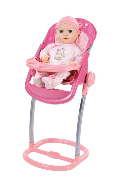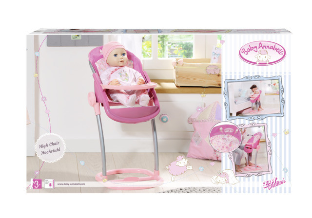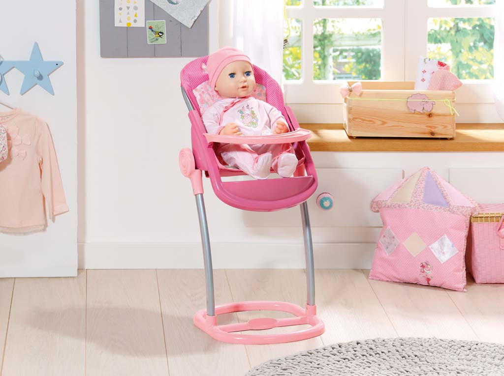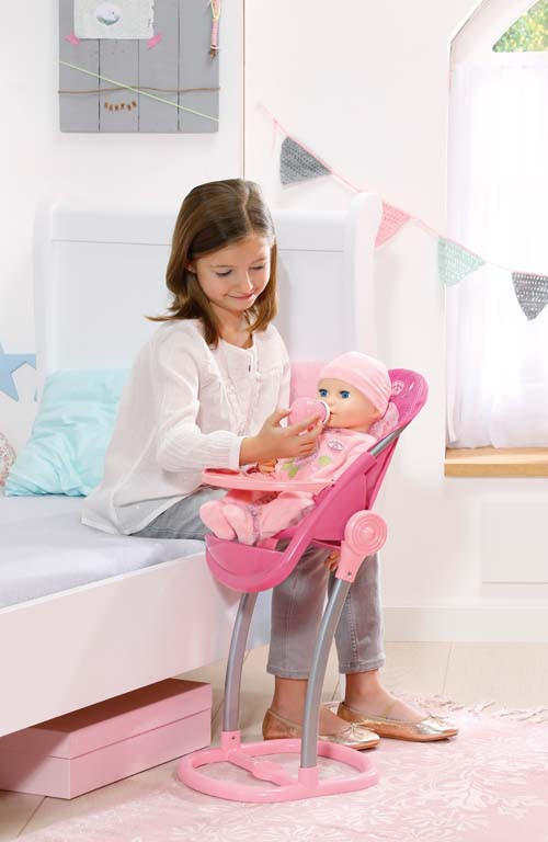 Jídelní židlička jako je tato je bez pochyby fantastický vynález. Je tak pohodlná! Baby Annabell v ní může sedět u stolu a je tak vždy nablízku, když si její malá maminka hraje, kreslí nebo obědvá s kamarády. Baby Annabell si může pohodlně opřít nožičky do opěrky a hrát si na stolečku. A samozřejmě nesmíme zapomenout na nejdůležitější funkci židličky – krmení!