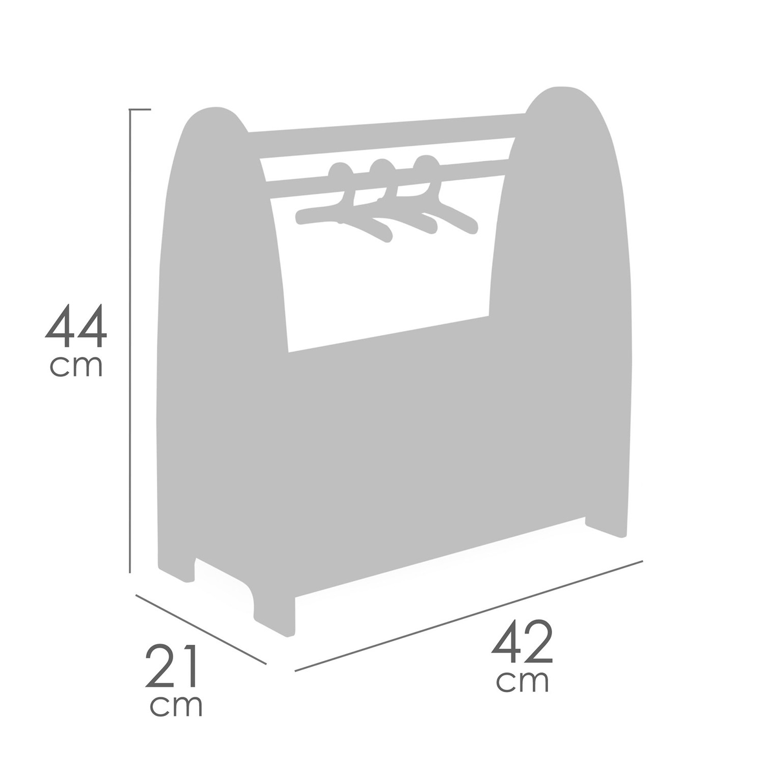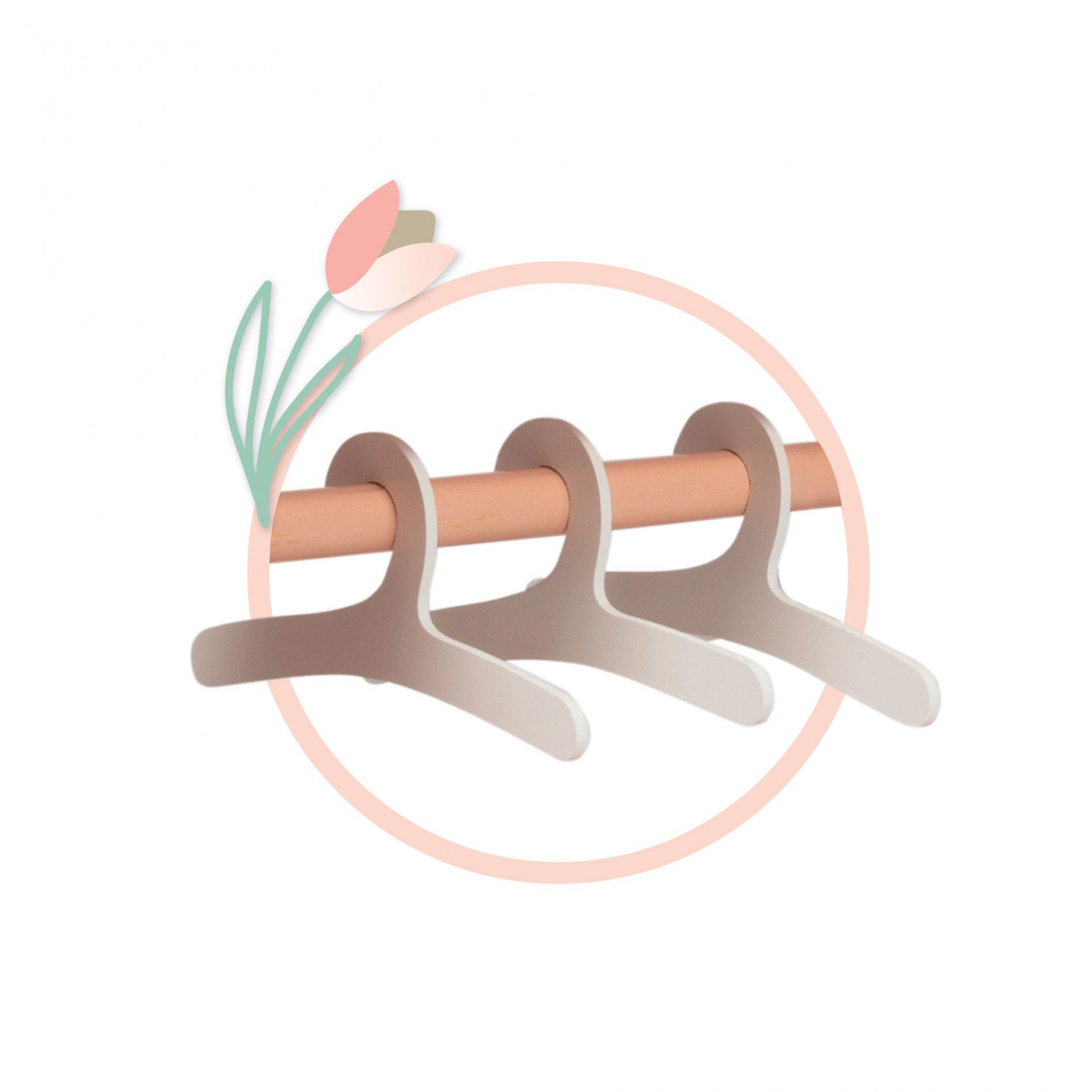 DeCuevas 55874 Dřevěný šatní věšák na oblečení pro panenky Tulipe 2025 patří do stejnojmenné kolekce, která je novinkou roku 2025 a nabízí výběr výrobků od jídelních sad přes postýlky a kočárky až po dřevěný nábytek pro panenky. Tulipe je, jak již sám název napovídá, kolekce plná tulipánů v překrásně sladěných teplých pastelových lososových barvách. Světlejší a tmavší odstíny barev jsou vkusně doplněné drobným květinovým vzorem ve stejných tónech na bílosmetanovém podkladu. Tento motiv ještě navíc u kočárků umocňují svým tematickým tvarem i překrásné, jako tulipán vypadající tašky. Květ tulipánu zdobí i dřevěné výrobky této kolekce.Doplňky a vybavení:• Šatní tyč v pastelové barvě• 3 dřevěná ramínka • 2 odkládací místa z toho jedno na horní polici • 2 skládací košíky na různé drobnosti 21 x 20 x 11 cm (š x h x v)• Rozměry věšáku: 42 × 21 × 44 cm (š x h x v)• Oblečení a doplňky nejsou součástí baleníDoplňující informace:• Nádherný španělský design• Precizní zpracování• Materiál: MDF, masivní dřevo, kov• Baleno v krabici v barvách kolekce• Rozměry balení: 21,6 x 7,2 x 45 cm (d x š x v) • Váha balení: 3 kg• U vybraných modelů je na obalech QR kód s videonávodem na sestavení • Doporučený věk od 3 letDeCuevas 55874 Dřevěný šatní věšák na oblečení pro panenky Tulipe 2025 ze stejnojmenné kolekce, která je novinkou roku 2025, je díky svým jemným pastelovým barvám krásným doplňkem dívčího pokojíčku a potěší jistě každou malou slečnu. Šatní tyč s ramínky poskytne dostatek prostoru pro u