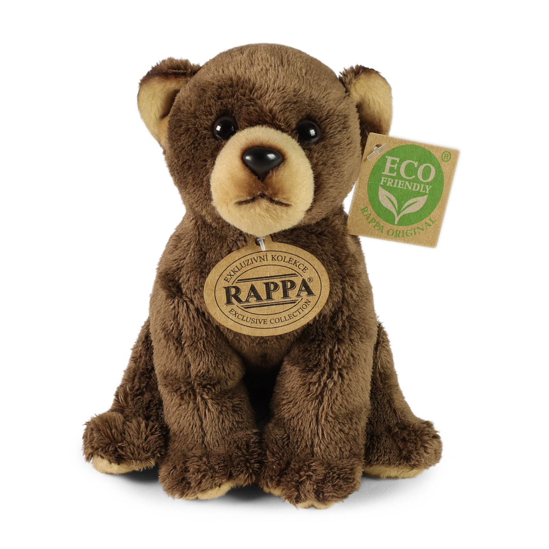 Plyšový medvěd hnědý měří 15 cm a díky těm nejkvalitnějším materiálům se řadí do Exkluzivní kolekce plyšových hraček značky Rappa. Díky ručnímu zpracování každého kusu navíc vypadá jako živý. Proč označení ECO-FRIENDLY? Rappa si je vědoma všech dopadů na životního prostředí, zaměřuje se na udržitelnost a omezení používání plastů na minimum. Proto je výplň hraček vyrobena z recyklovaných materiálů, zejména PET lahví. Ta je však zcela nezávadná a vhodná i pro děti od narození. FUN FACT: Věděli jste, že čich medvěda je 7x citlivější než čich psa?