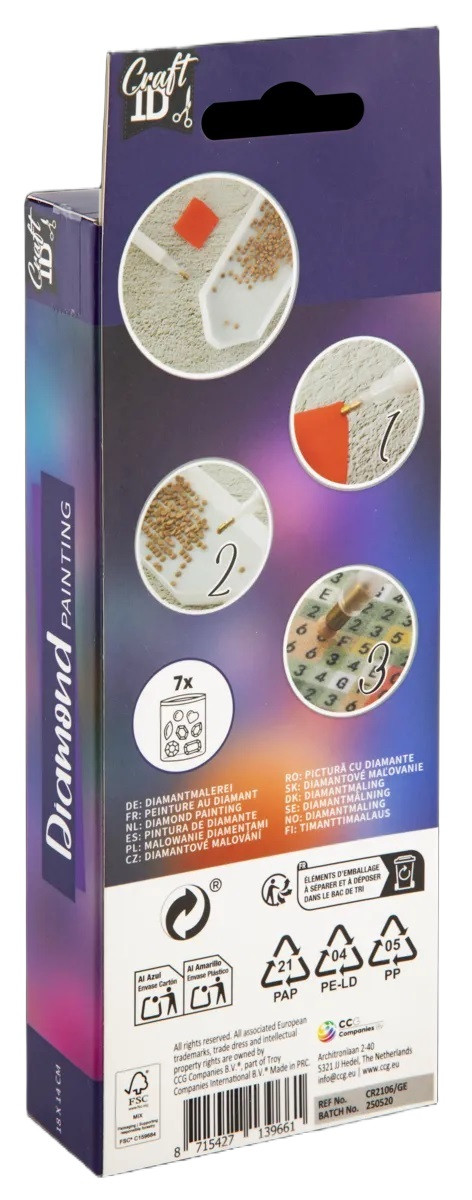 Kreativní set diamantové malování obsahuje kamínky/diamanty různých barev, aplikační pero, lepící čtvereček, tácek a předlohu. Umísti podle čísel na předloze přiřazené kamínky a vznikne ti nádherný diamantový obrázek o velikosti 18x14 cm