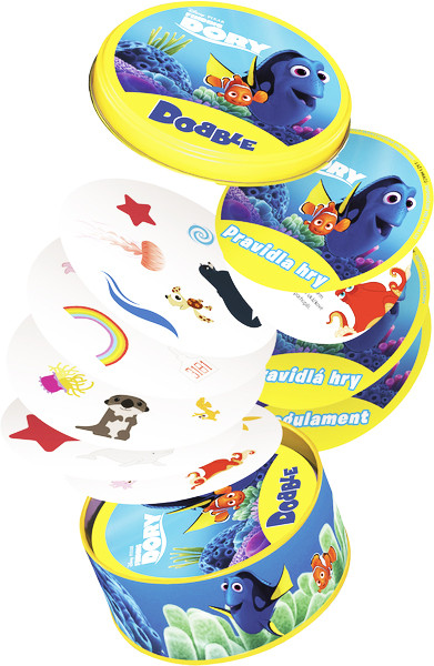 Rychlost, postřeh, reflexy! Další verze velmi oblíbené hry Dobble je Dobble - Hledá se Dory. 50 různých symbolů, 30 karet, 8 symbolů na kartě a každé dvě karty spolu mají společný pouze jeden! Hra nabízí zcela unikátní zábavu. Hráči zde hledají dva stejné symboly na kartách při různých verzích hry (v pravidlech je popsáno celkem 5 her). Super jsou kulaté karty i jednoduchá pravidla vysvětlená doslova za pár sekund. Cílová skupina jsou děti i rodiče - všichni, kdo se chtějí pořádně bavit a nemají čas pročítat dlouhá pravidla. Plechová krabička zaručuje bezpečí karet a je i další přidanou hodnotou.