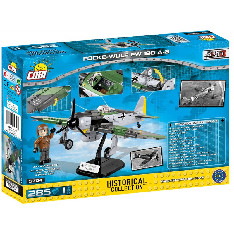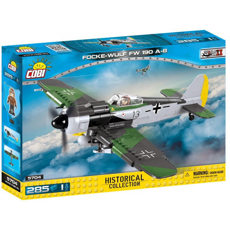 Postavte si model německého stíhacího letounu Focke-Wulf Fw 190. Jednosedadlový a jednomotorový letoun verze A-8 byl nejvíce vyráběnou verzí. Balení obsahuje 285 kostek stavebnice a 1 figurku pilota Luftwafe.