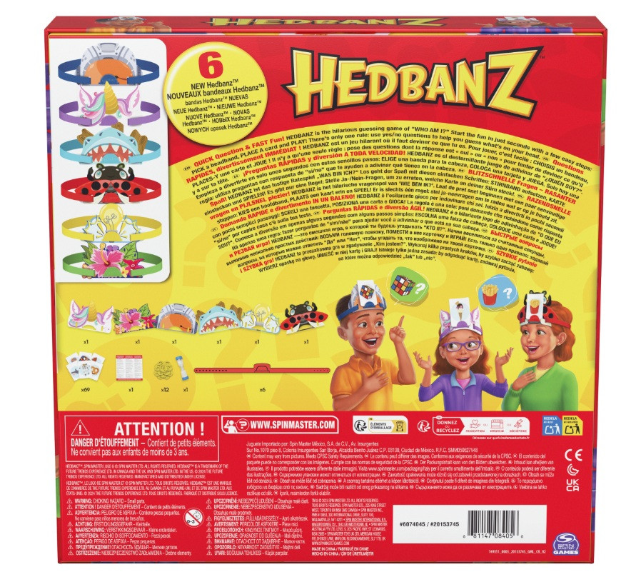 Rychlá hádací hra Co jsem? je zpátky v druhém vydání! Hedbanz od Spin Master Games je zábava pro celou rodinu! V této nové hře je 6 nových čelenek: dinosaurus, narval, robot, květina, motýl a mozek. Také tu jsou zbrusu nové ilustrace na kartách jako například Jsem sluneční brýle nebo Jsem had. Pokládejte kreativní otázky typu Jsem pizza? nebo Jsem pes?, abyste zjistili, co je na vaší kartě z kategorie zvíře, věc nebo jídlo. Hra Hedbanz je jednoduchá: stačí vzít kartu, umístit ji a hrát! Vyberte si jednu čelenku a vezměte kartičku s obrázkem, aniž byste se na ni dívali. Nasaďte si čelenku a zasuňte kartu do čelenky tak, aby obrázek mířil k ostatním hráčům. Hra se hraje pomocí otázek s odpověďmi ano a ne vaším cílem je uhodnout, co máte na kartě. Staňte se prvním hráčem, který nasbírá tři odznáčky, a vyhráváte! Hedbanz je nezbytným doplňkem vaší sbírky deskových her pro děti ve věku 8–12 let, ale pobaví každého od 6 let výš. Je vhodná pro 2–6 hráčů a poslouží vždy, když budete potřebovat hračky pro dívky ve věku 6–8 let, rodinné deskové hry nebo hry pro děti. Hedbanz je společenská aktivita pro celou rodinu, která pobaví všechny generace. Je to klasická hra s hádáním obrázků, která je známá už roky! Ať už hledáte deskové hry pro děti ve věku 6–8 let nebo zábavné hry, tato nová edice Hedbanz plná nových barevných karet a roztomilých čelenek vás určitě pobaví. Díky jednoduchým pravidlům je hra srozumitelná pro všechny. Začněte hádat s druhým vydáním Hedbanz! Spin Master přináší d