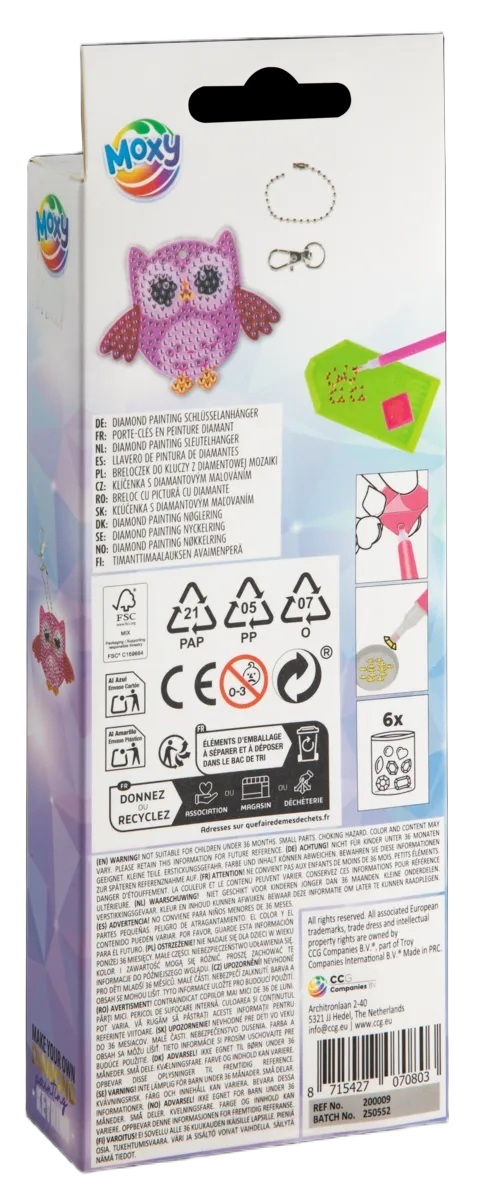Kreativní set vyrob si svůj diamantový přívěsek ve tvaru sovy. Součástí balení je přívěsek,různě barevné diamanty/kamínky, lepící sada s perem k lepení a umisťování drahokamů do přívěsku, tácek, řetízek a karabinka. Tento parádní přívěsek lze nosit na batohu, klíčích nebo kdekoliv jinde tě napadne.