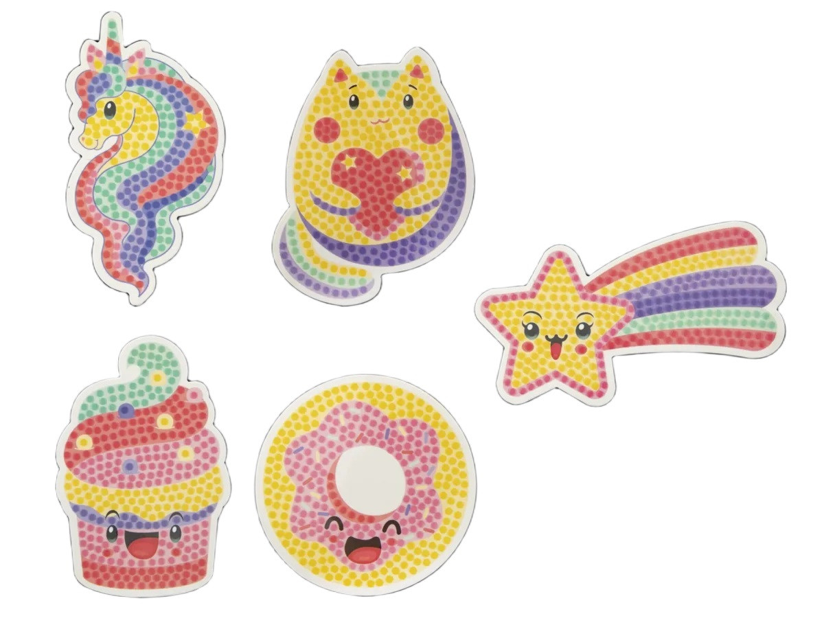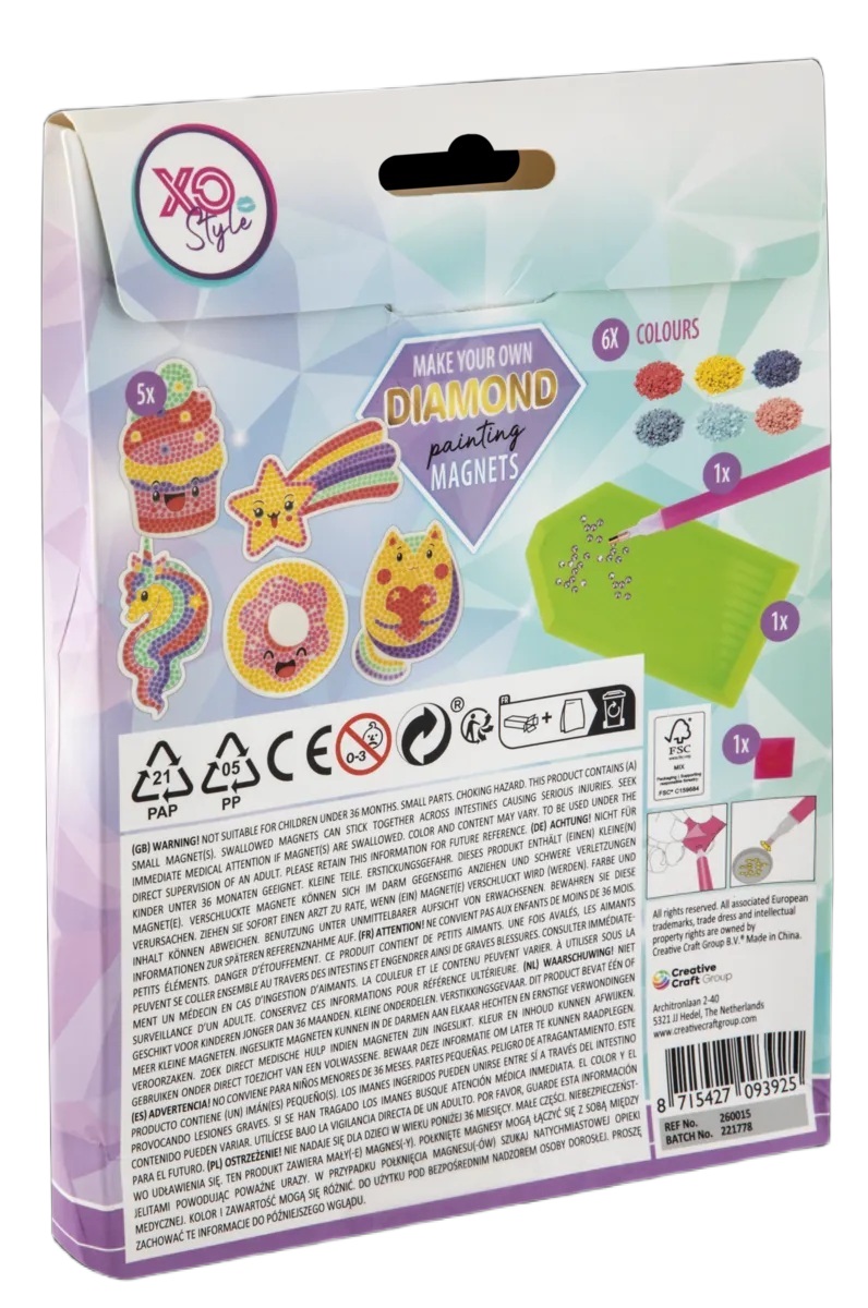 Kreativní sada na výrobu diamantových magnetů, které ozdobí lednici nebo každý povrch, kam lze magnety umístit. Sada obsahuje 2850+ diamantů/kamínků, předlohu/magnety k dokončení - 5 kusů, aplikační pero, lepící čtvereček a tácek, 18x13 cm
