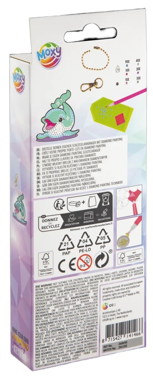 Kreativní set vyrob si svůj diamantový přívěsek ve tvaru delfína. Součástí balení je přívěsek,různě barevné diamanty/kamínky, lepící sada s perem k lepení a umisťování drahokamů do přívěsku, tácek, řetízek a karabinka. Tento parádní přívěsek lze nosit na batohu, klíčích nebo kdekoliv jinde tě napadne.