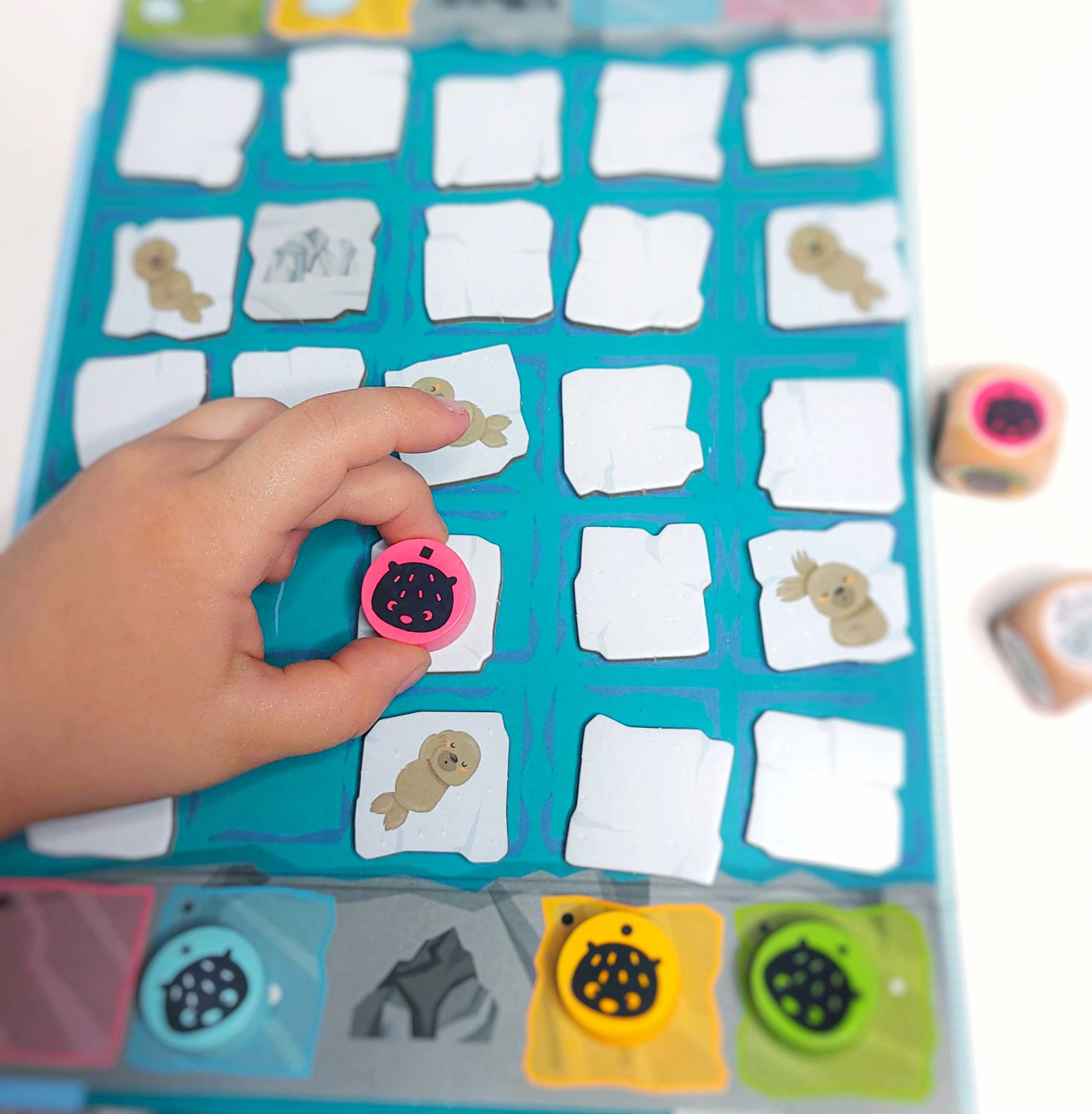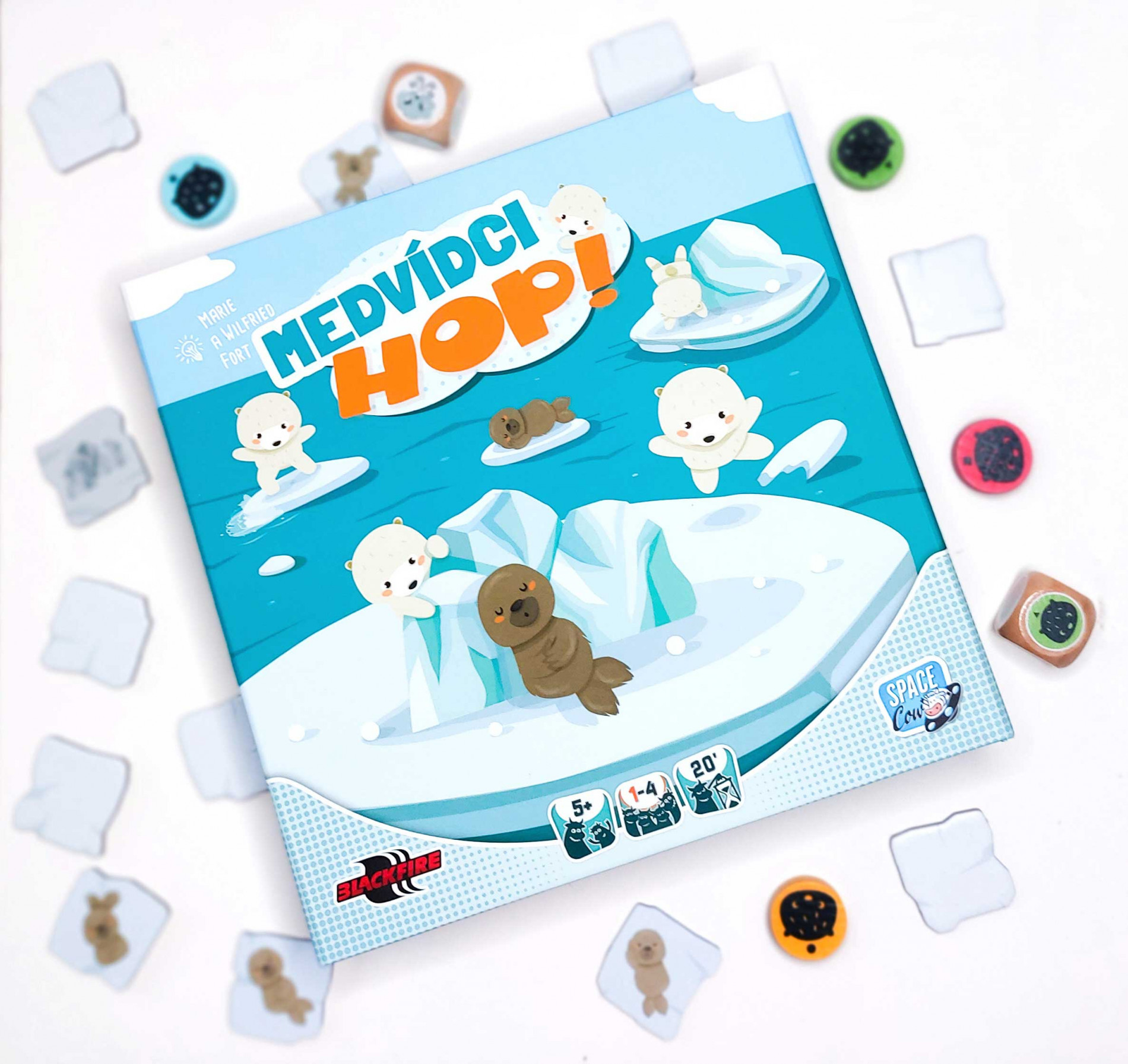 Jejda! Čtyři medvídci jsou pozadu! Musí dohonit své rodiče na břehu za plovoucími ledovými krami. Jenže led je tenký a tuleni nemají rádi, když je při odpočinku někdo ruší. Pomozte medvídkům přeskákat po krách na ledové pole na druhé straně dříve, než se všechny kry rozpustí.1. Přeskakujte s medvídky z jedné ledové kry na druhou.2. Pomocí větru rozhýbejte kry a postupujte rychleji.3. Ale pozor, led může popraskat!Vyzkoušejte také podobnou hru z této řady - Ovečky HOP!Obsah balení:1 česká pravidla a slovenská pravidla4 žetony medvídků25 dílků2 kostky
