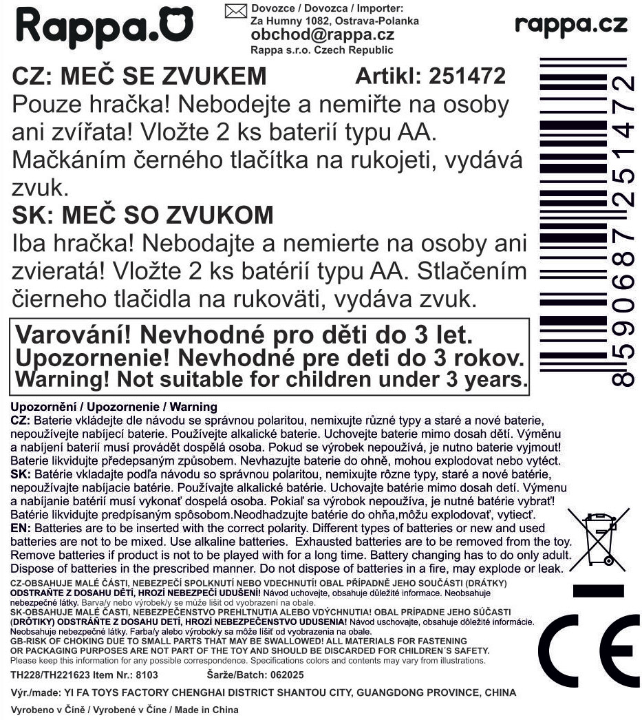 Rytířský meč s pouzdrem promění každé dítě v odvážného hrdinu! Malí rytíři mohou vyrazit do boje, chránit království a zažít spoustu dobrodružství na každém karnevalu či při domácí bitvě. Meč v délce 55 cm vydává zvuky. Pro zvuk je potřeba vložit do rukojeti 2 baterie typu AA, které nejsou součástí balení.