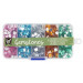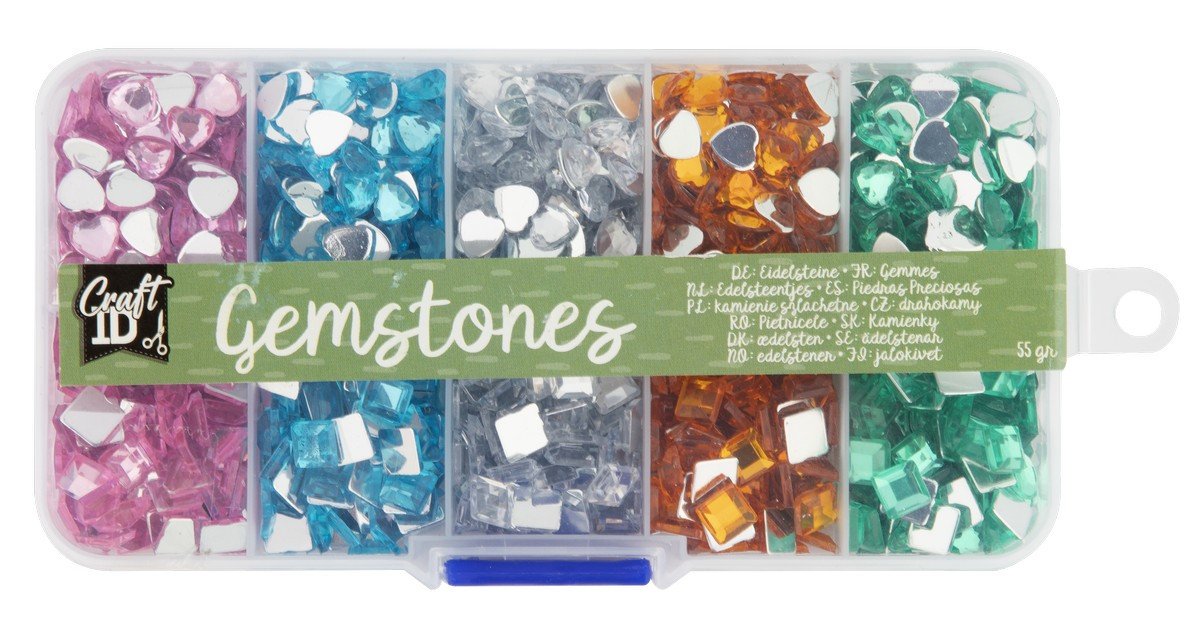 Sada krásných barevných drahokamů v 5 barvách a 2 tvarech (kulaté diamanty a ve tvaru hvězdy) – celkově tedy 10 různých dekorativních kamínků. Baleno v praktickém plastovém pořadači.