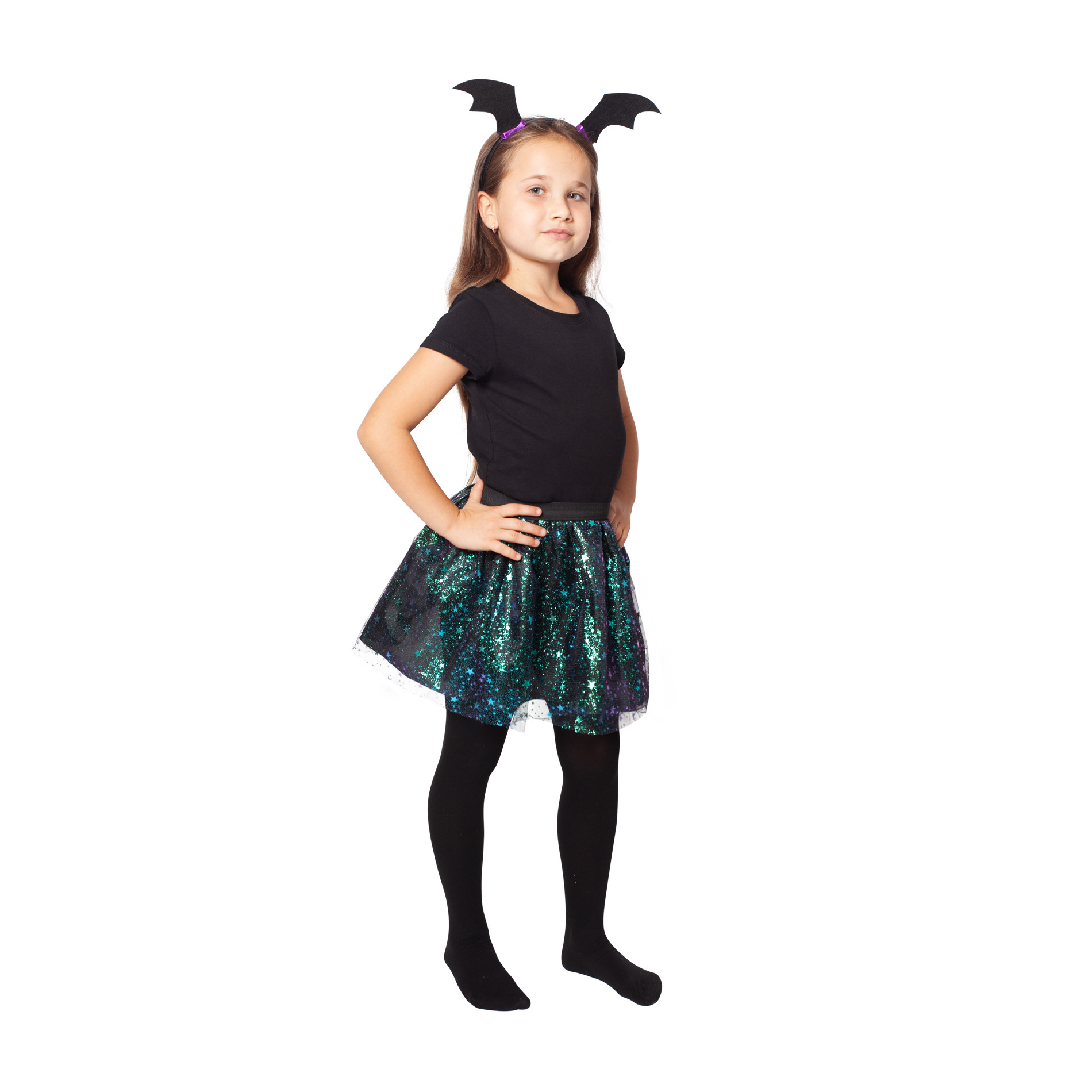 Sukně TUTU pro malé čarodějnice zdobená dekorem hvězdiček je určen pro holčičky ve věkovém rozmezí 3-7 let. Balení obsahuje nadýchanou sukničku a k tomu perfektně sladěnou čelenku netopýra. Skvěle se hodí i na oslavu Halloweenu nebo karneval! Sukně je v pase na gumičku a délka je cca 30 cm.