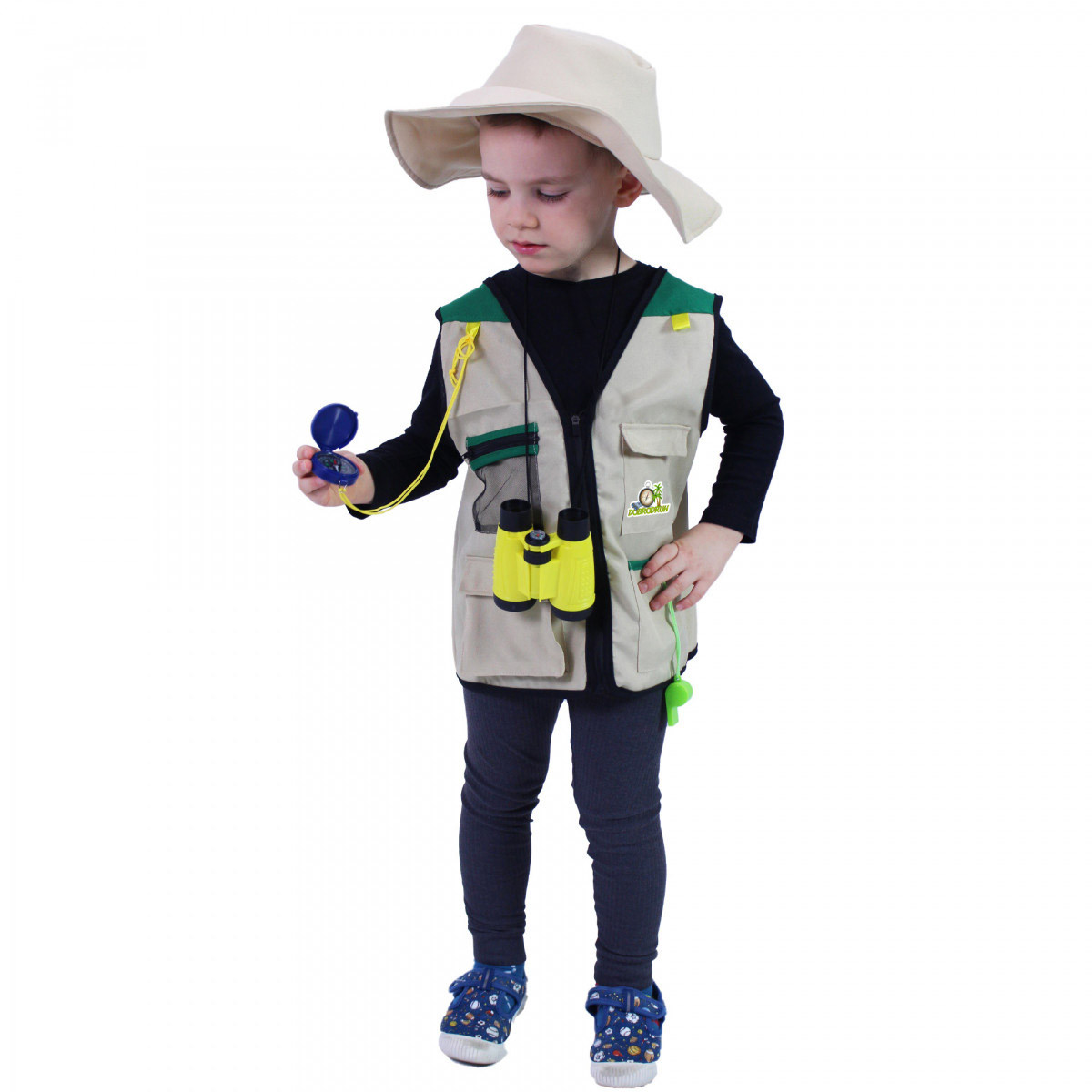 Vydaj sa na dobrodružnú výpravu s týmto parádnym vybavením! Karnevalový kostým v štýle malého dobrodruha je určený pre chlapčekov vo vekovom rozmedzí 3-7 rokov (104-134 cm). Balenie obsahuje vestu, klobúk (bez šnúrky), ďalekohľad, lupu, píšťalku a kompas.