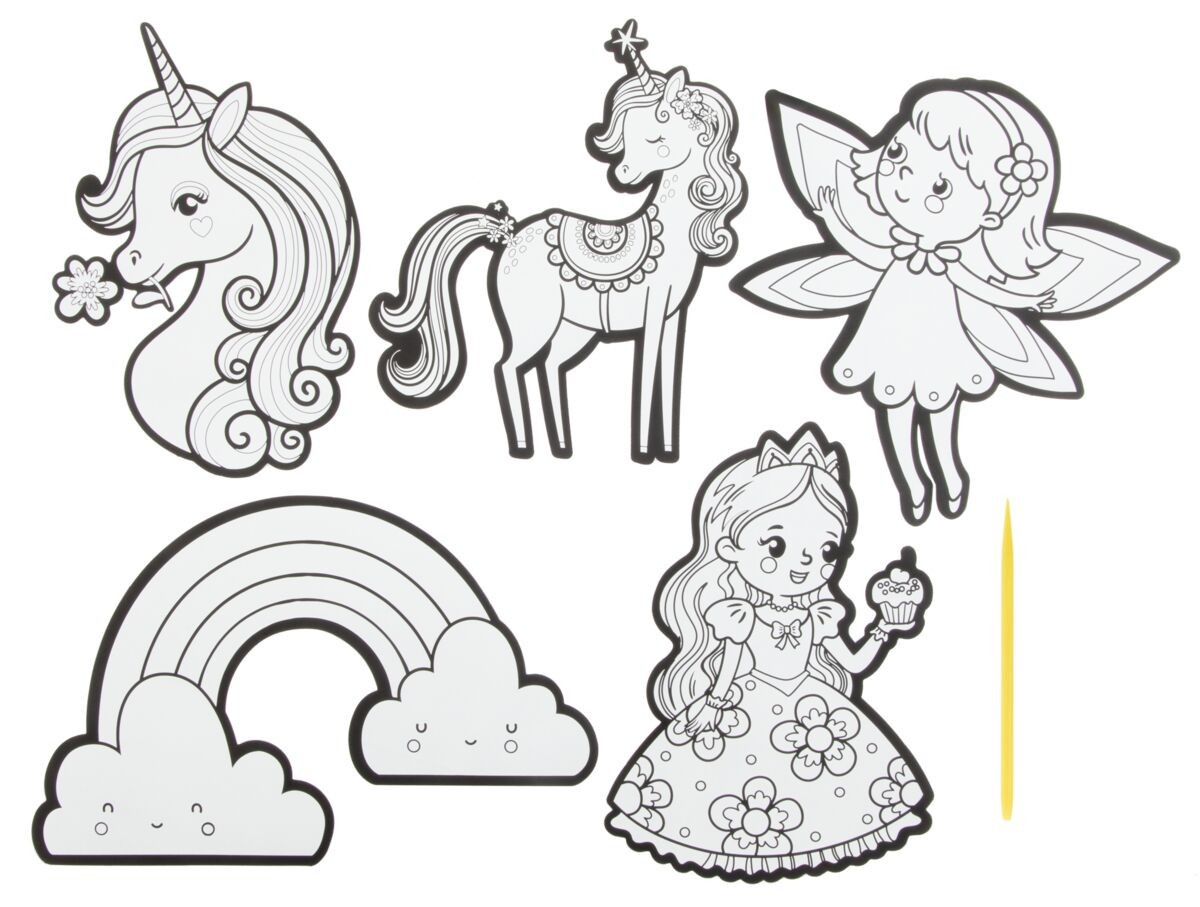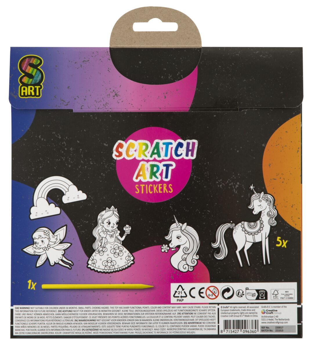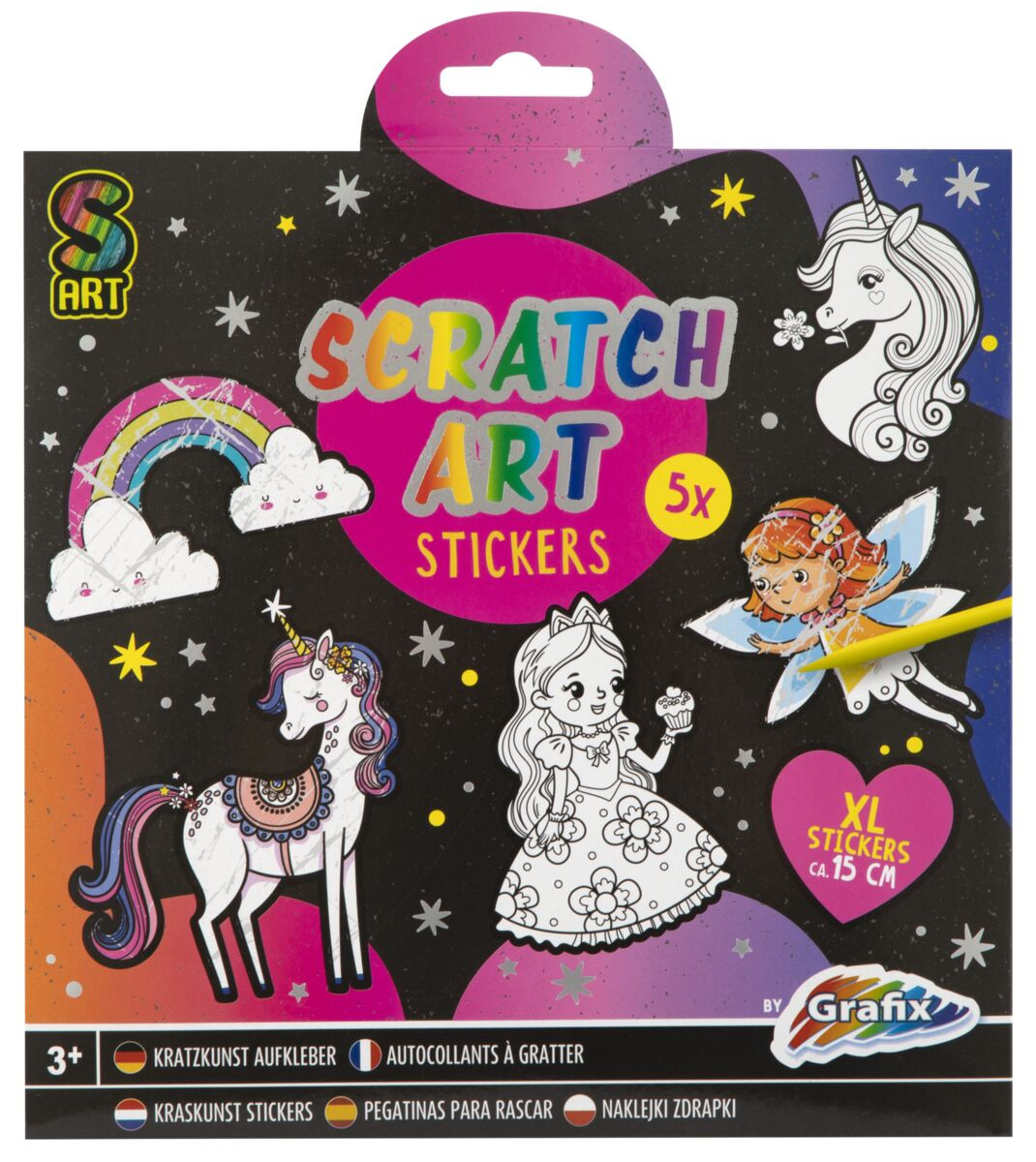 Kreatívny set obsahuje 5 kusov vyškrabávacích samolepiek a vyškrabávacie pero, veľkosť samolepky je cca 15 cm