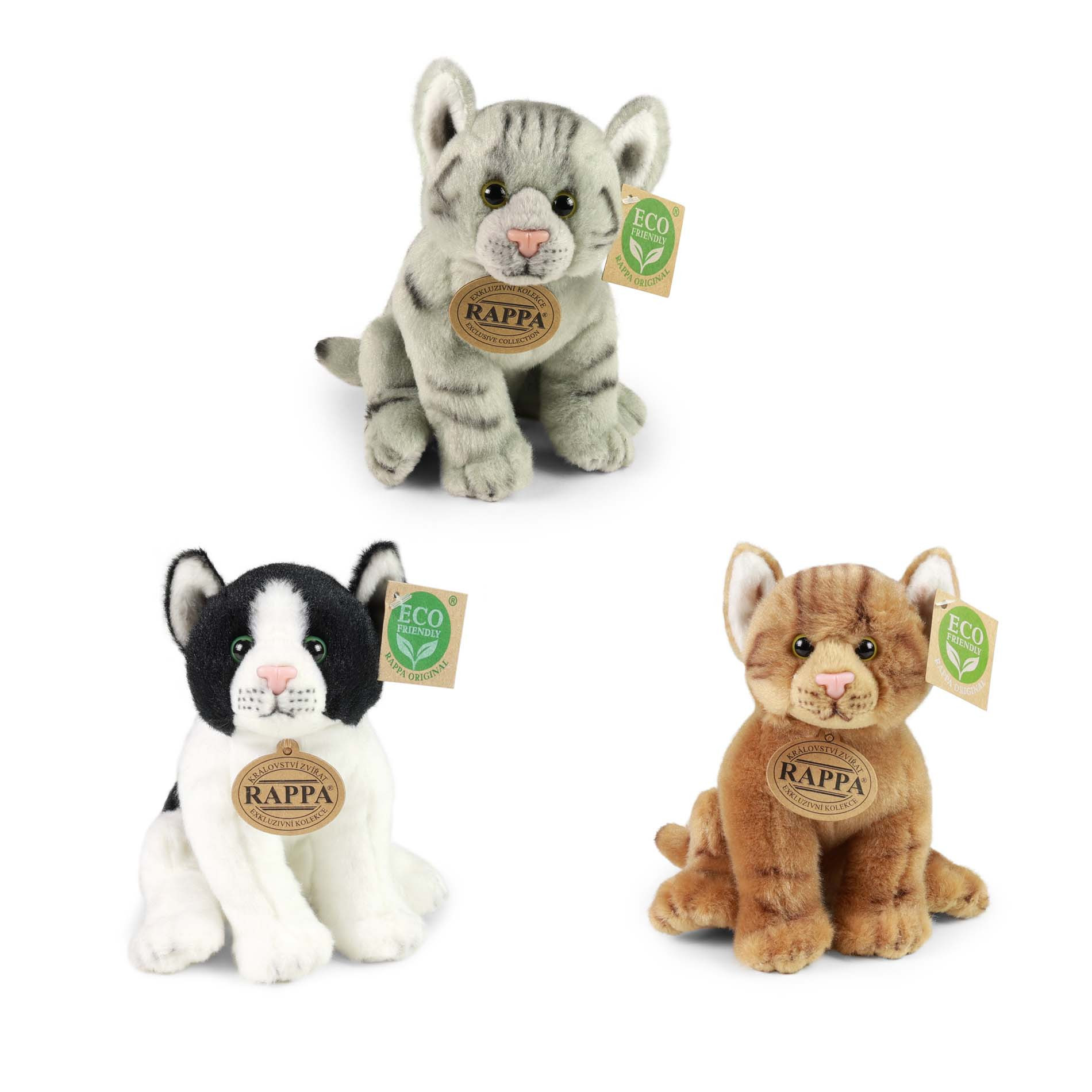 Nádherná plyšová mačka o veľkosti 20 cm v troch druhoch. Mačka je vyrobená z kvalitnej plyše a je tak súčasťou exkluzívnej kolekcie plyšových hračiek RAPPA. Rozhodli sme sa ísť zelenou cestou čo najmenej zaťažujúci životné prostredie - cestou ECO-FRIENDLY. Čo to vlastne ECO-FRIENDLY znamená? Výplň plyšové hračky je vyrobená z recyklovaných PET fliaš. Tento materiál je úplne bezpečný, na omak nerozoznateľný od štandardnej výplne a plne atestovaný pre bezpečnosť aj tých najmenších.