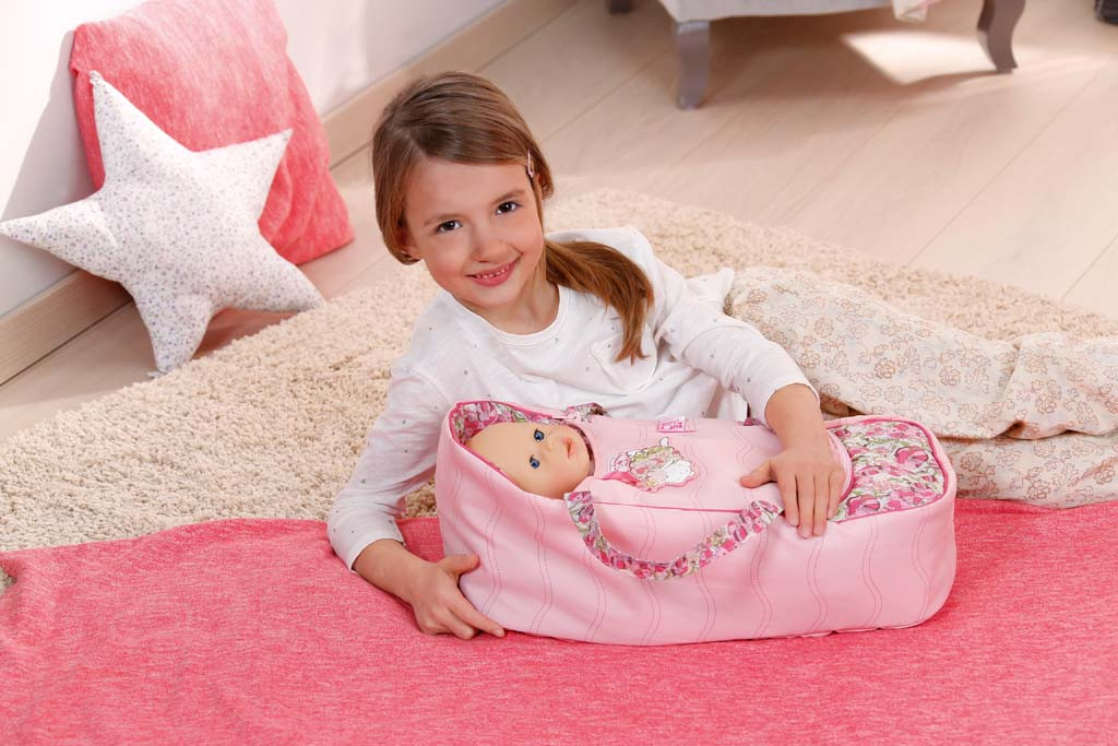 Prenosná postieľka je praktickým doplnkom pre bábiky Baby Annabell. Môžete ju vziať so sebou a Baby Annabell sa tak vyspí do ružova kdekoľvek a kedykoľvek. Postieľka je zdobená romantickým kvetinovým vzorom a ozdobnými švami. Aby sa Baby Annabell na cestách cítila v postieľke bezpečne, možno hornú časť uzavrieť zipsom tak, aby Baby Annabell bola vidieť len hlava. Súčasťou postieľky je mäkký vankúšik. Určené pre bábiky do 46 cm.