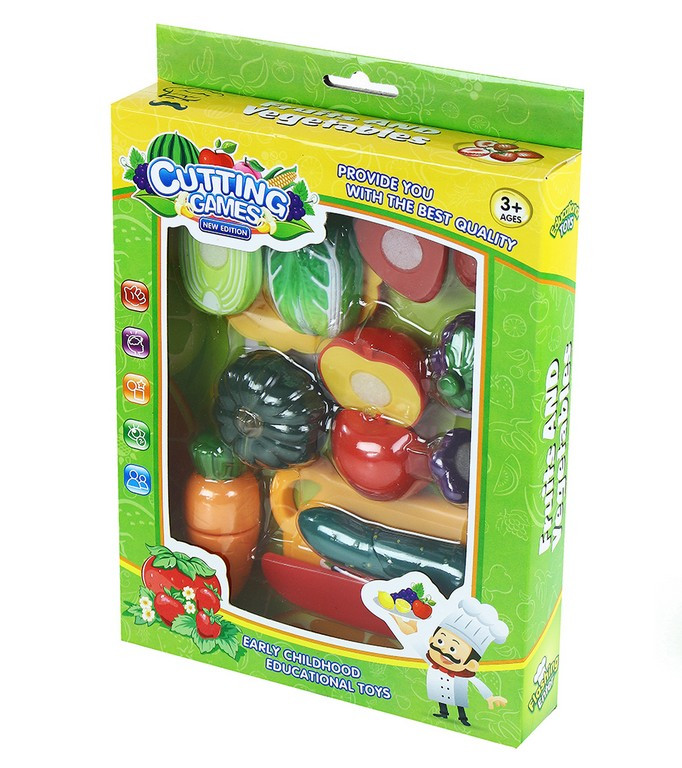 Plastové napodobeniny potravín na suchý zips. Sada obsahuje 7 druhov zeleniny alebo ovocia, doštičku s nožom, ktorým ich môžete rozkrojiť a 2 taniere.