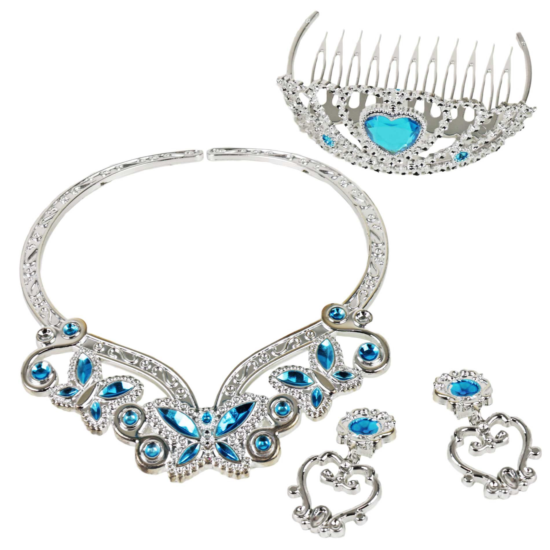 Krásna korunka s náušnicami a náhrdelníkom pre všetky snehové princezny. Doplnky sú zdobené modrými prvkami a korunka navyše neprehliadnuteľným ozdobným kamienkom. Perfektná sada ku kostýmu! Doporučené pre dievčatá od 3 rokov .