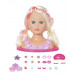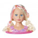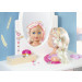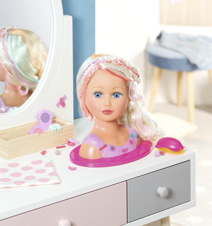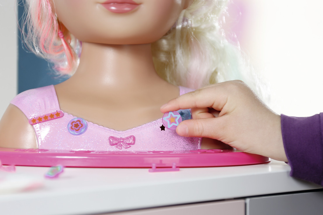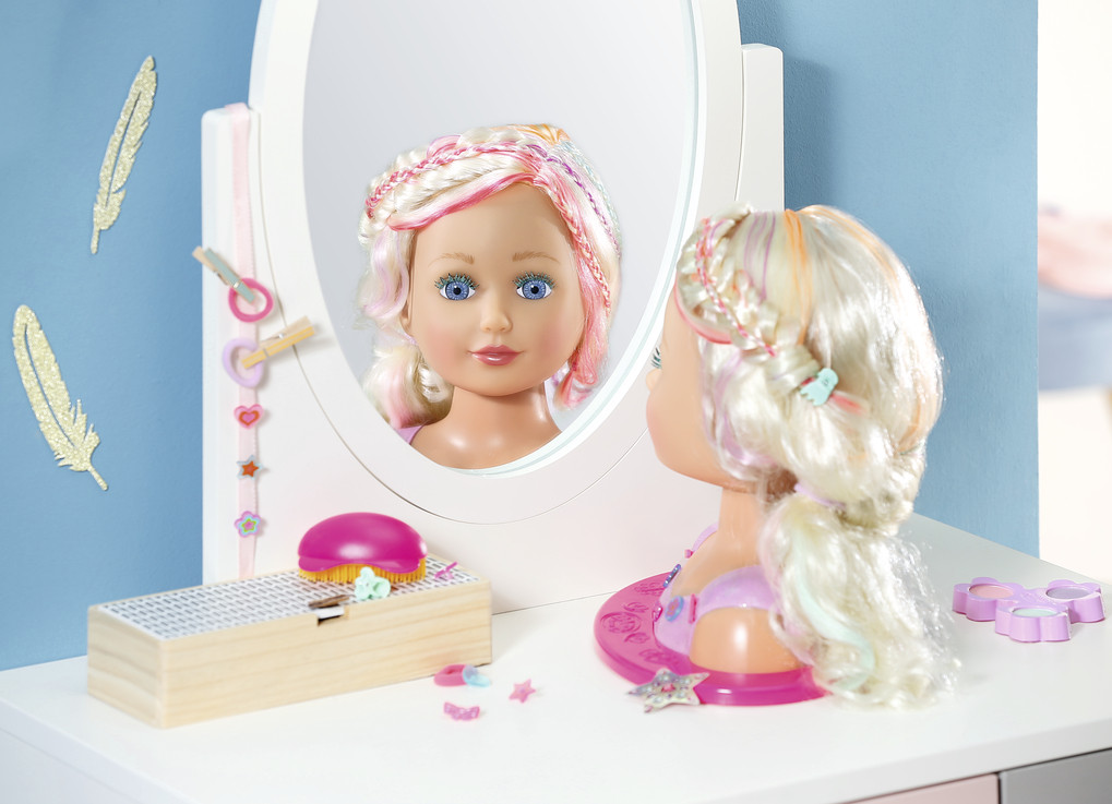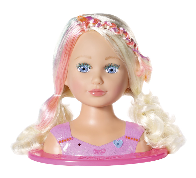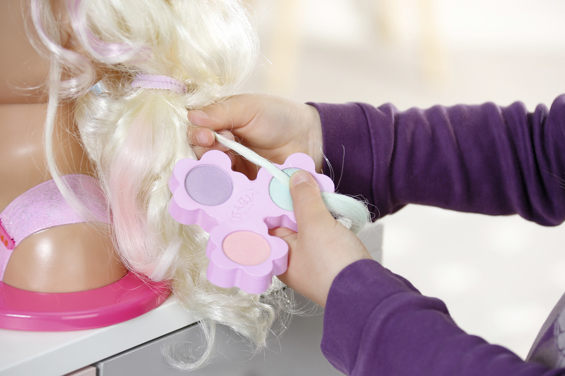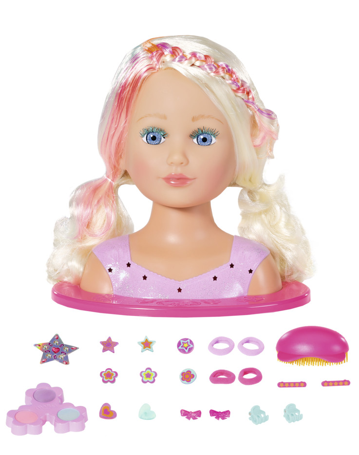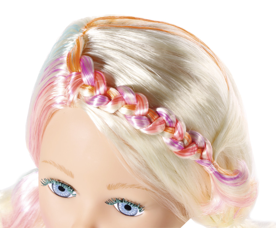 To sú ale krásne farebné vlásky ... Česací hlava má v blonďatých vláskoch niekoľko farebných pramienkov. Malá kaderníčka tak môže vymýšľať nápadité účesy treba zapletením farebného pramienku do blonďatých vláskov a vytvoriť tak viacfarebný vrkôčik. Štyri gumičky a dve sponky vždy udrží nádherné kvalitné vlásky presne tam, kde majú byť. Blonďavé vlásky môžu byť ešte krajšia, ak je obarvíš farebnými kriedami - ružovú, fialovú a tyrkysovú. A keď má malá modelka na vláskoch farby už moc, stačí kriedu jednoducho vyčesať. Nacvakávacie ozdoby a nálepky rôznych tvarov a farieb sú skvelou ozdobou na krk a tvár bábiky. A samozrejme si nejde nevšimnúť tých krásnych trblietavých rias ... Staršie sestrička BABY born Česacia hlava s farebnými kriedami s množstvom šikovných doplnkov.