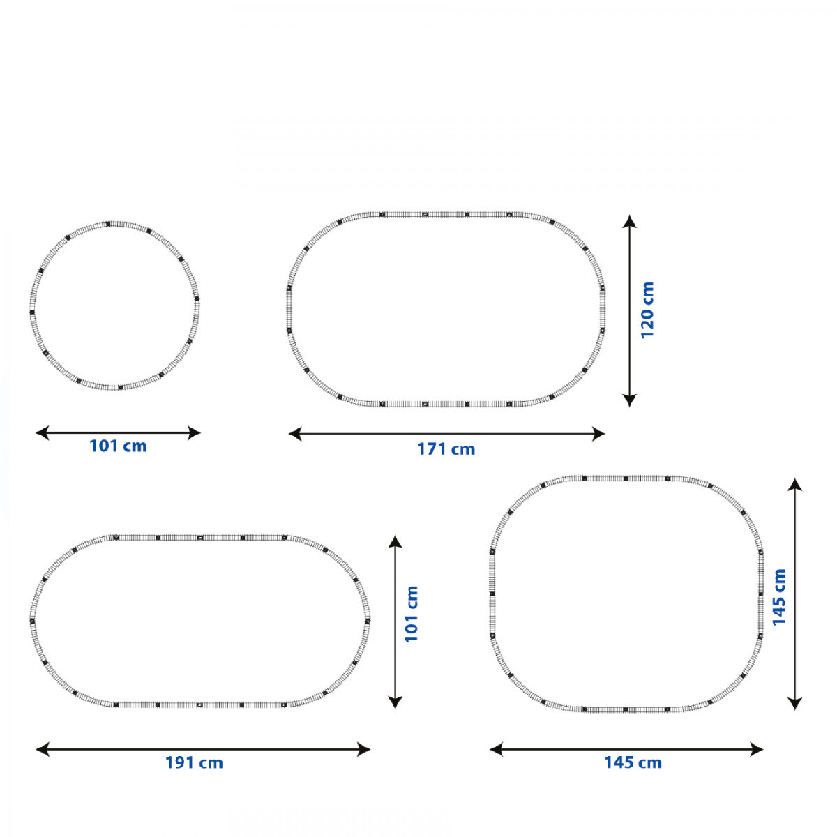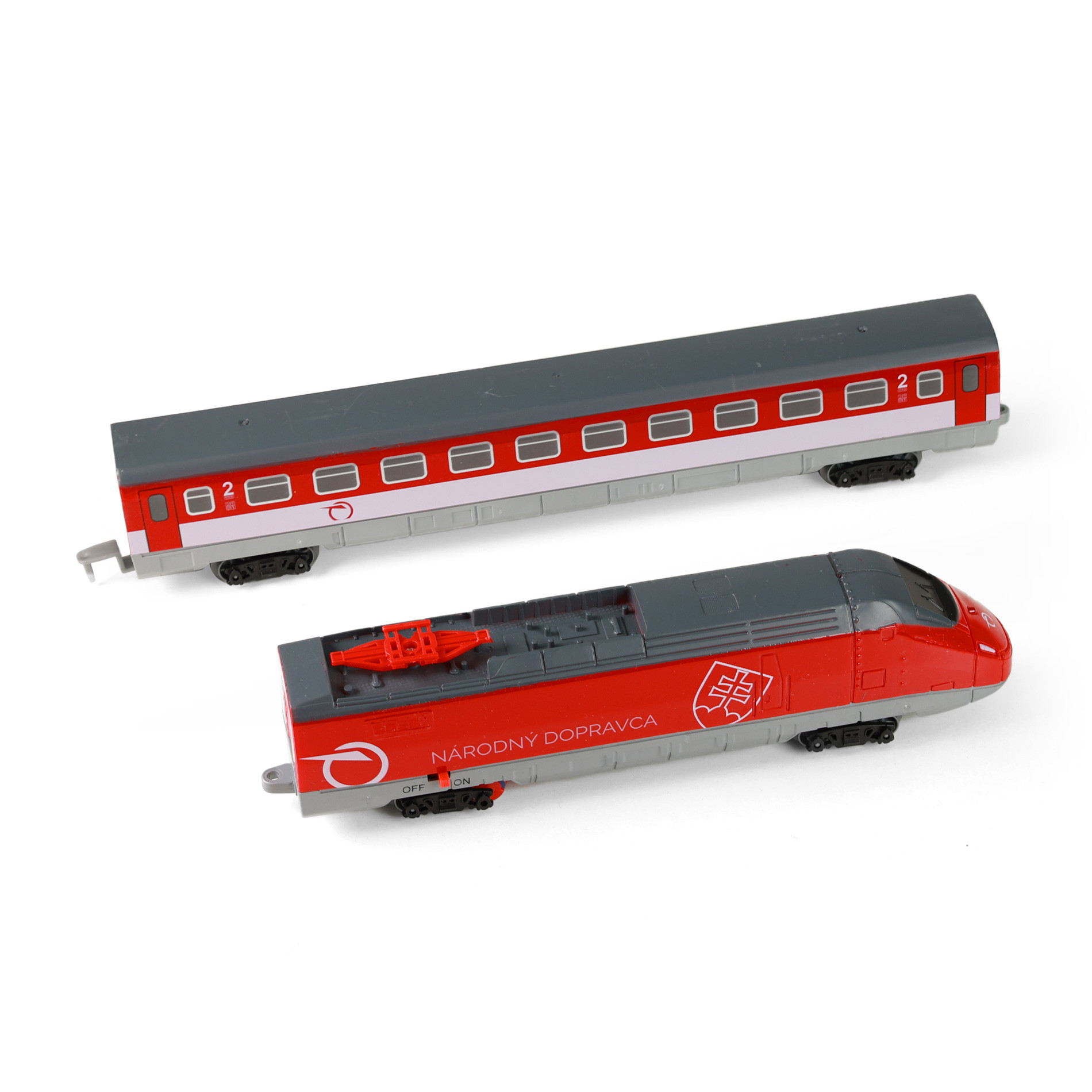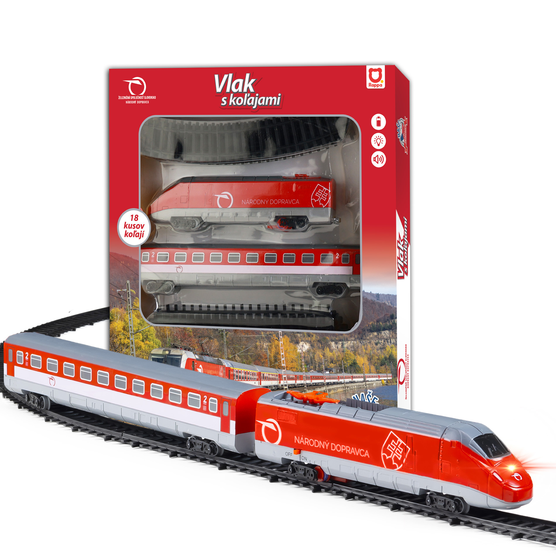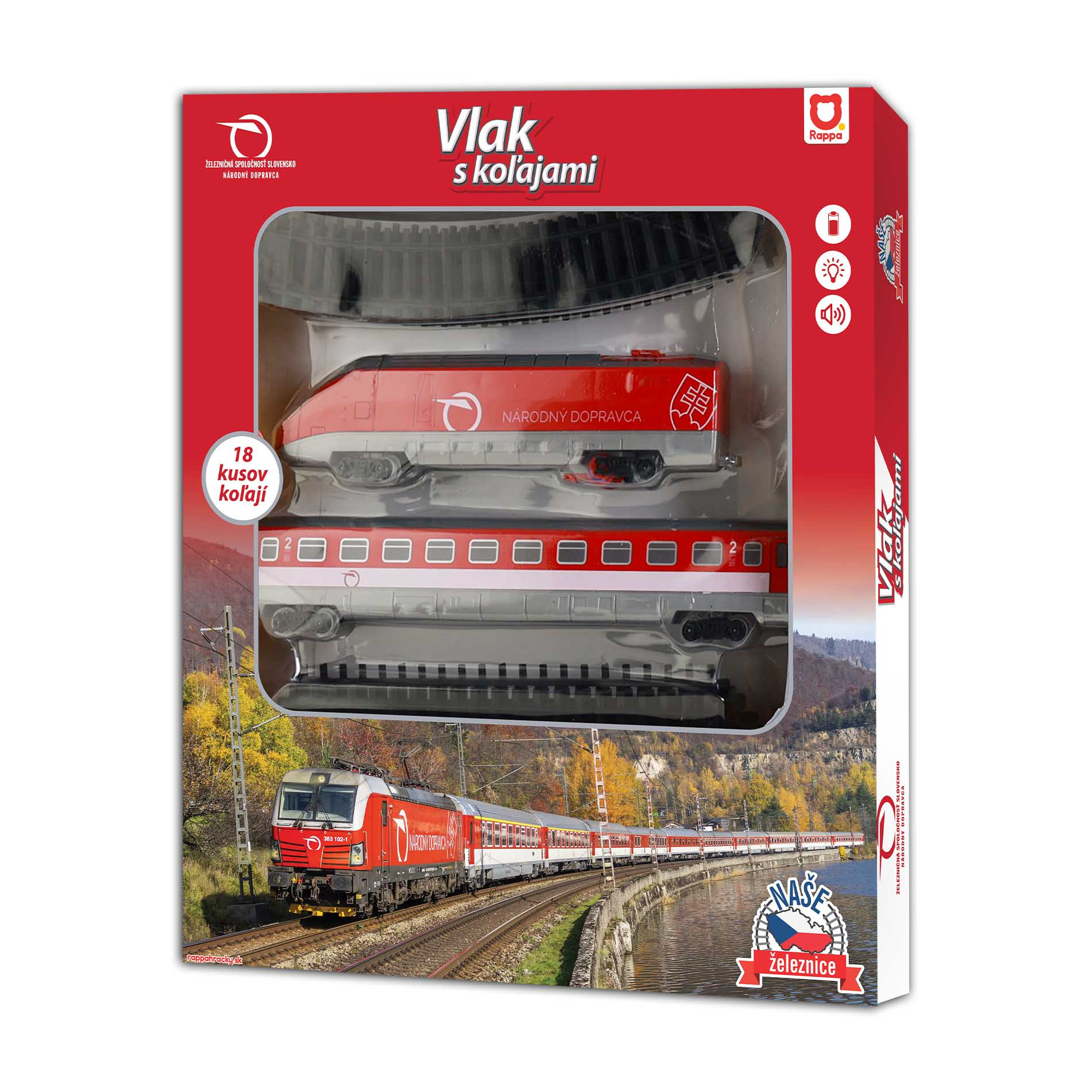 Sada Železničná spoločnosť Slovensko obsahuje lokomotívu, vagón, 12 zahnutých a 6 rovných koľají. Lokomotíva meria na dĺžku 23,5 cm a vagón 30 cm. Lokomotíva jazdí, vydáva zvuk a svieti vďaka 2 ks AA batérií (nie sú súčasťou balenia). Je možné vytvoriť koľajisko až do veľkosti 147 x 121 cm (cca 4,4 m). Rozteč koľají je 2,1 cm. Veľkosť koľaje rovná je 23 cm a zahnuté 25 cm. Túto novinku je možné kombinovať s vlakom Českej dráhy, Pendolino a RegioJet. Touto originálnou vlakovou sadou dráh určite potešíte všetkých milovníkov a nadšencov železníc.