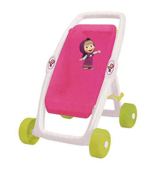 Sportovní kočárek pro panenky s motivy dětského seriálu Máša a medvěd. Rám plastový. Výška k řídítkům 49 cm. Rozměry: 36 x 49 x 45 cm (D x V x H).